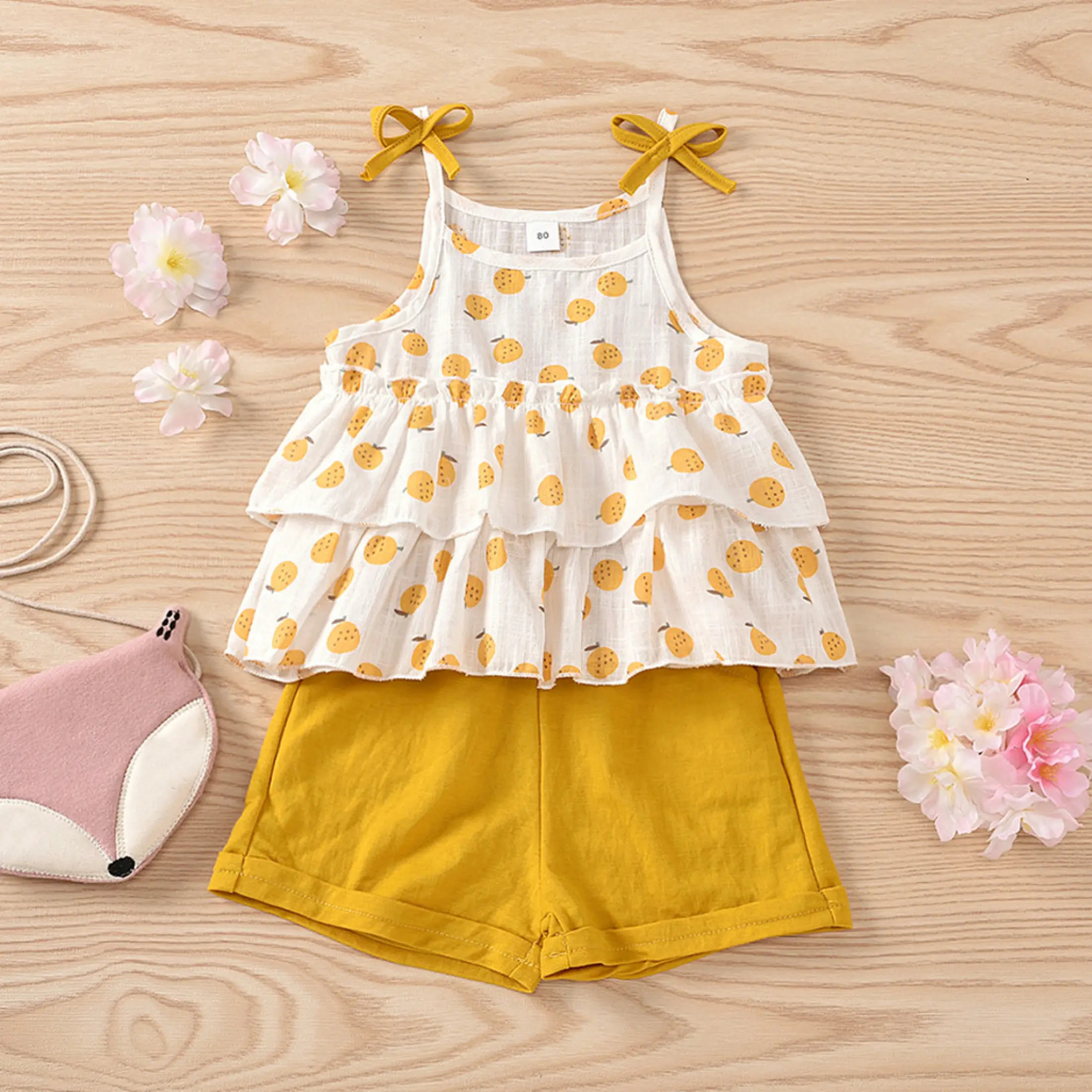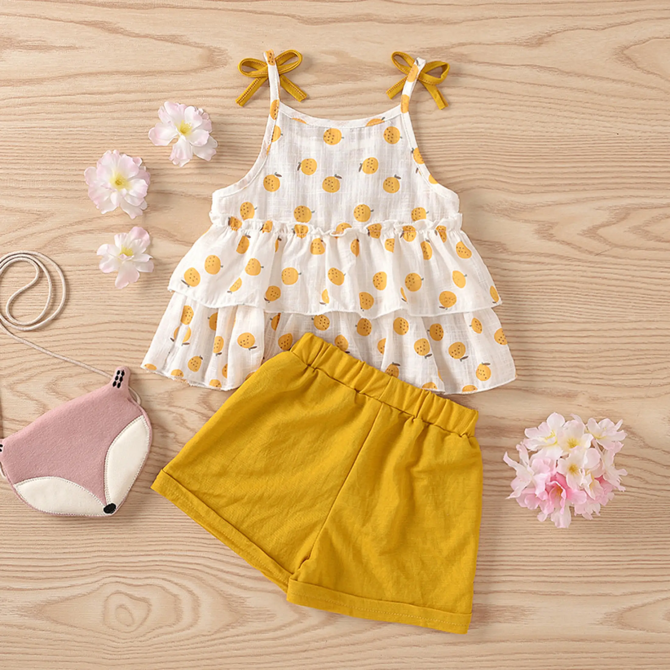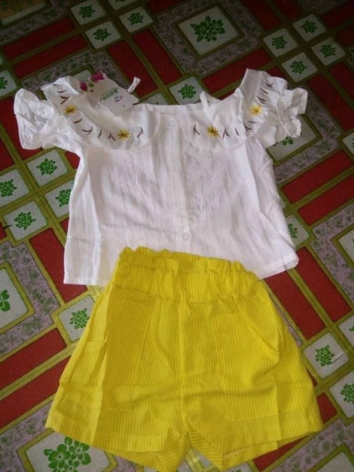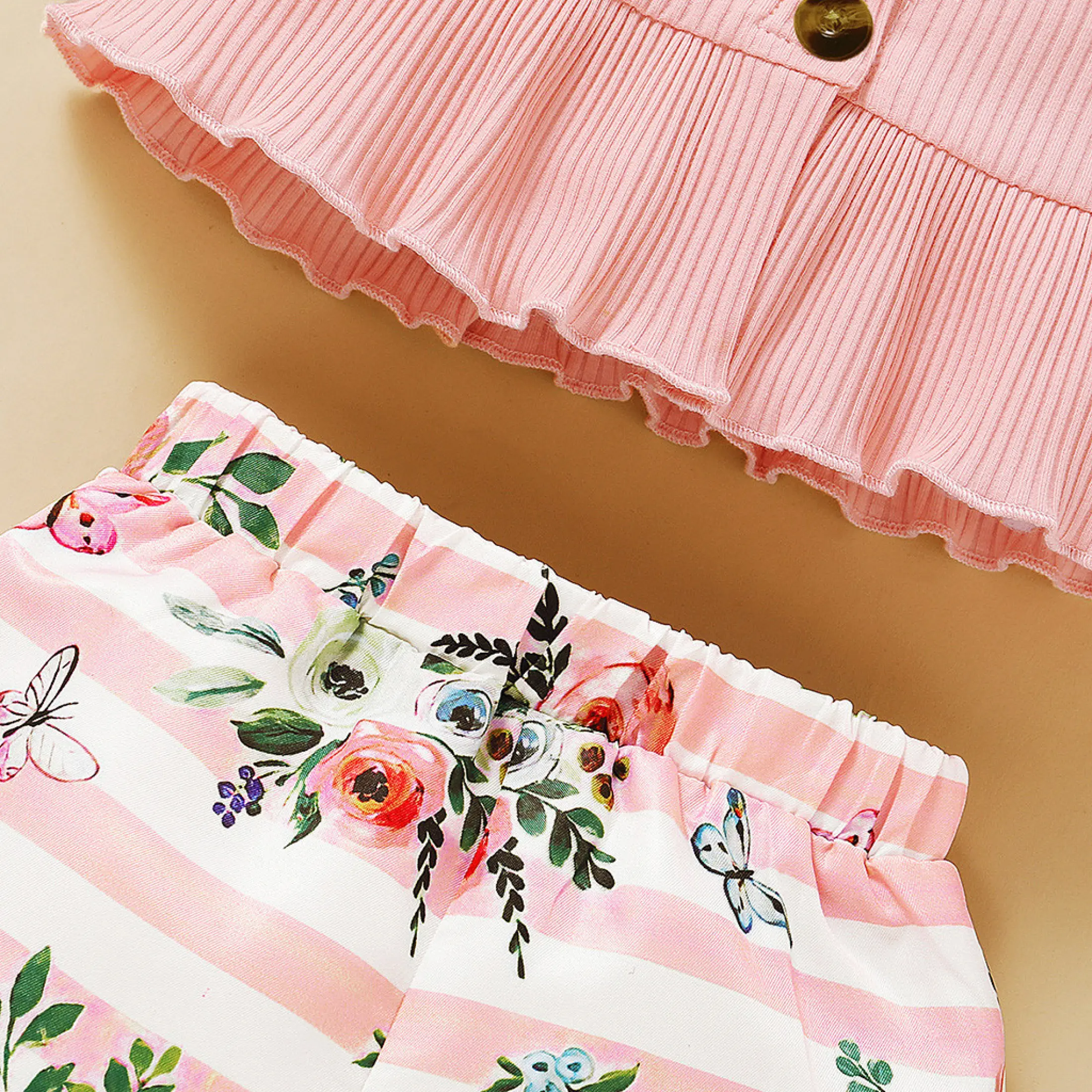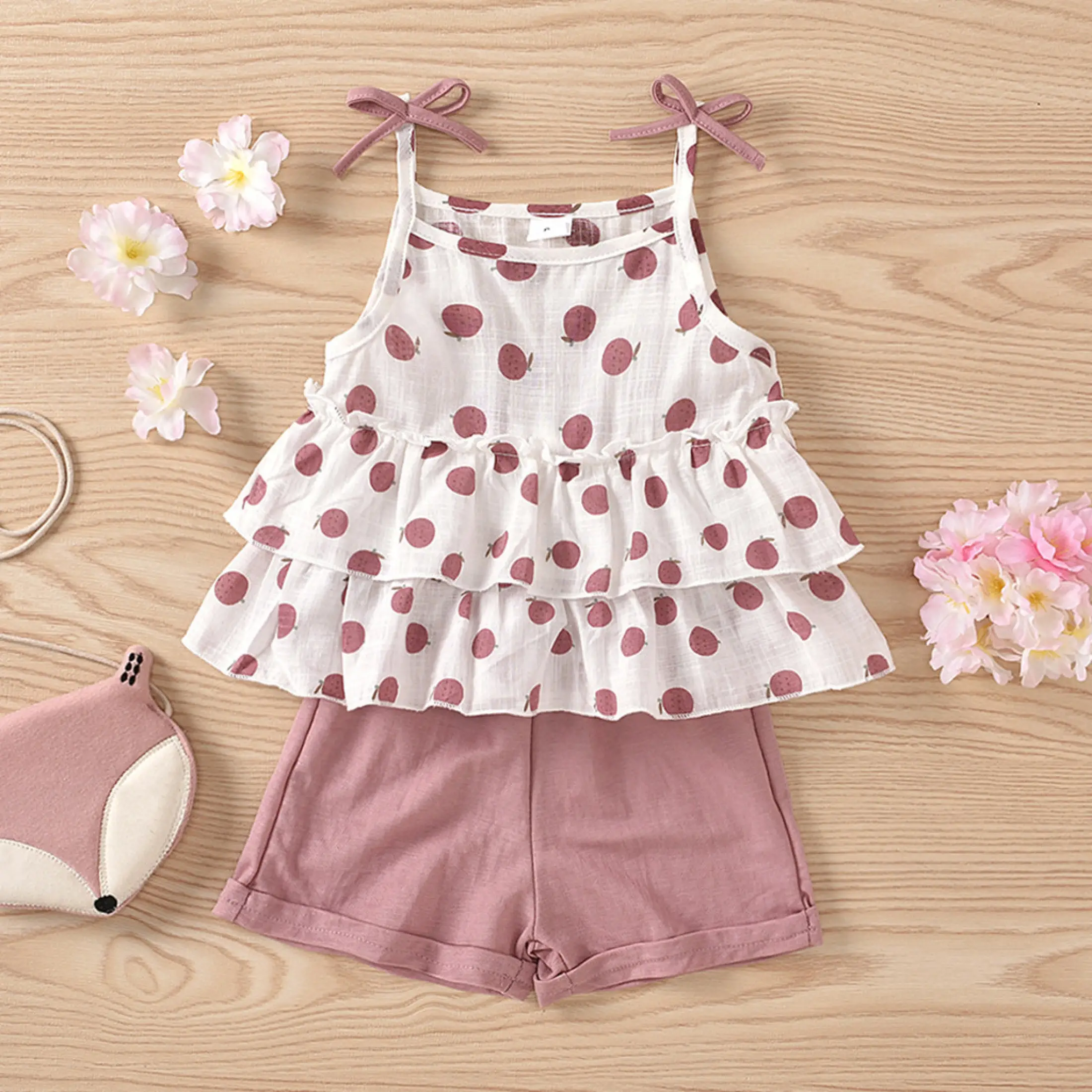 Lazadacarell Balita Perempuan Bahu Terbuka Bunga Cetak Atasan Berkerut Padat Celana Pendek