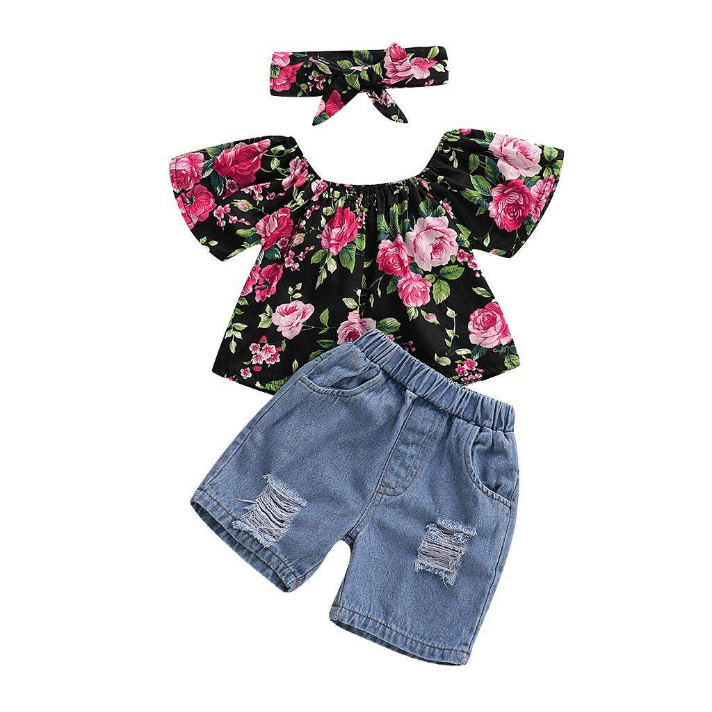 Cnb2c Balita Bayi Perempuan Bahu Terbuka Bunga Baju Atas Cetak Lubang Jeans Denim Celana Pendek Penjualan Terlaris Lazada Indonesia