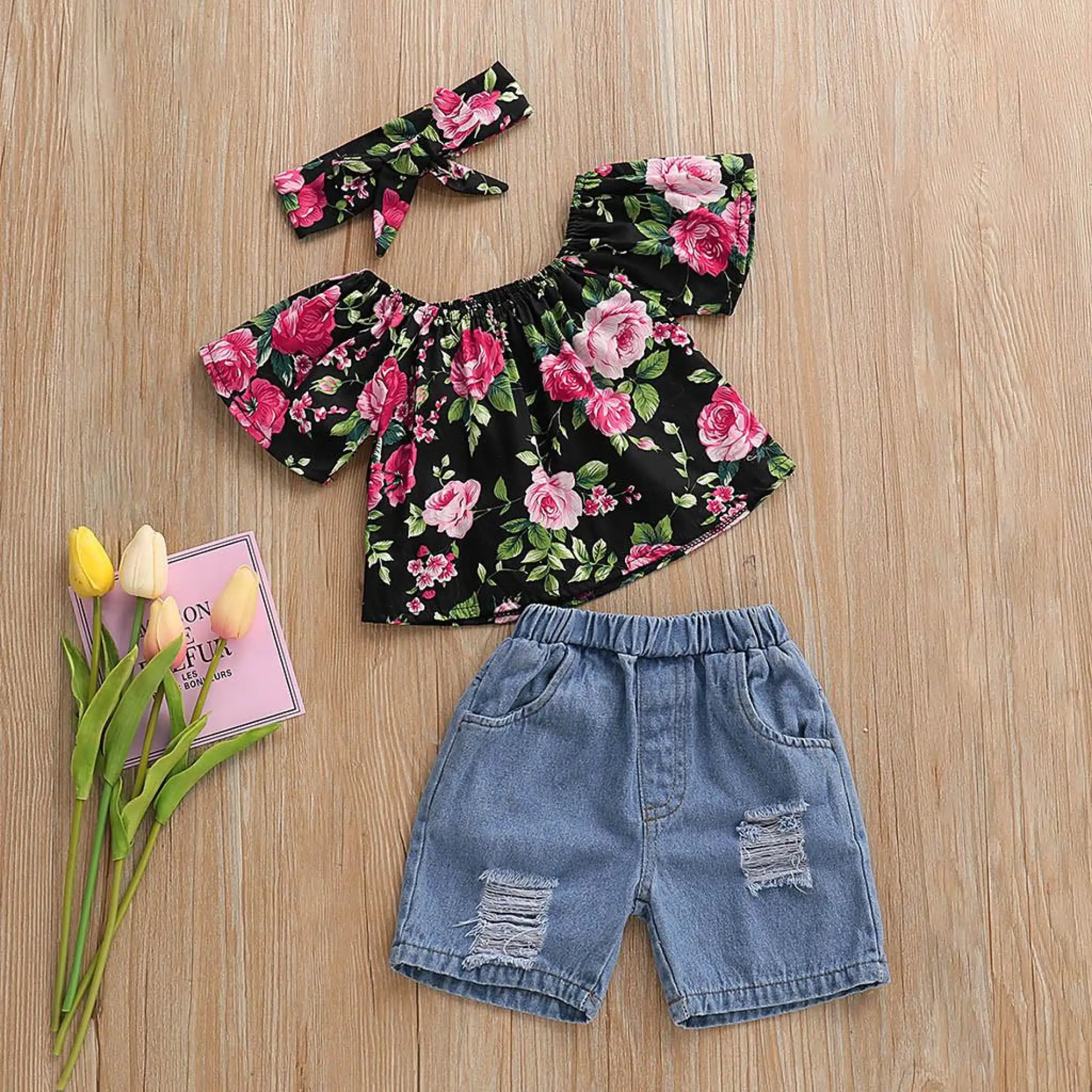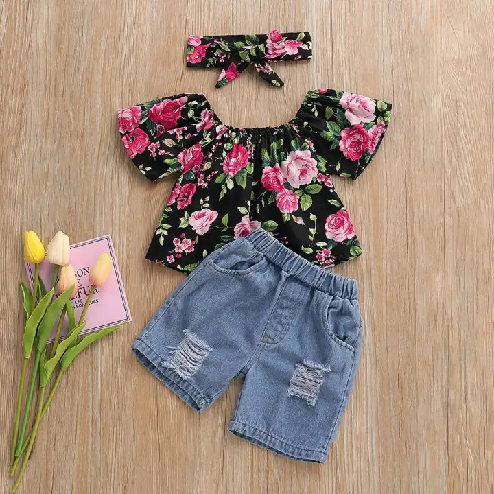 Pakaian Terusan Bahu Terbuka Untuk Balita Perempuan 2 Potong Atasan Lipit Celana Pendek Denim Robek Motif Bunga Pakaian Wanita Isi 2 Potong Lazada Indonesia